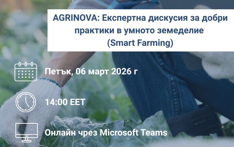 Интересувате се от бъдещето на селското стопанство? Присъединете се към експертната дискусия на AGRINOVA за интелигентното земеделие! Споделете своя опит и научете за най-добрите практики в сектора. 6 март | 14:00 Кликнете тук, за да си осигурите място сега:  https://forms.office.com/e/zpqtqAGpzJ